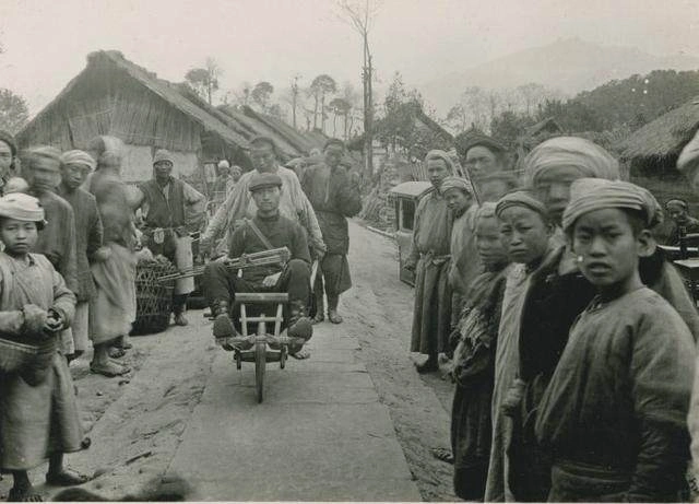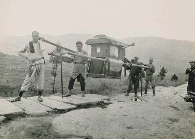 坐着滑竿游玩的外国人,两名中国人都是草鞋