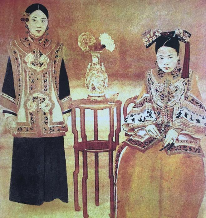 清朝贵妇着色像,右边是醇亲王奕譞的侧福晋刘佳氏,典型的清朝贵妇。10厘米左右的装饰道具指甲套很显眼,但是还没有慈禧的长。