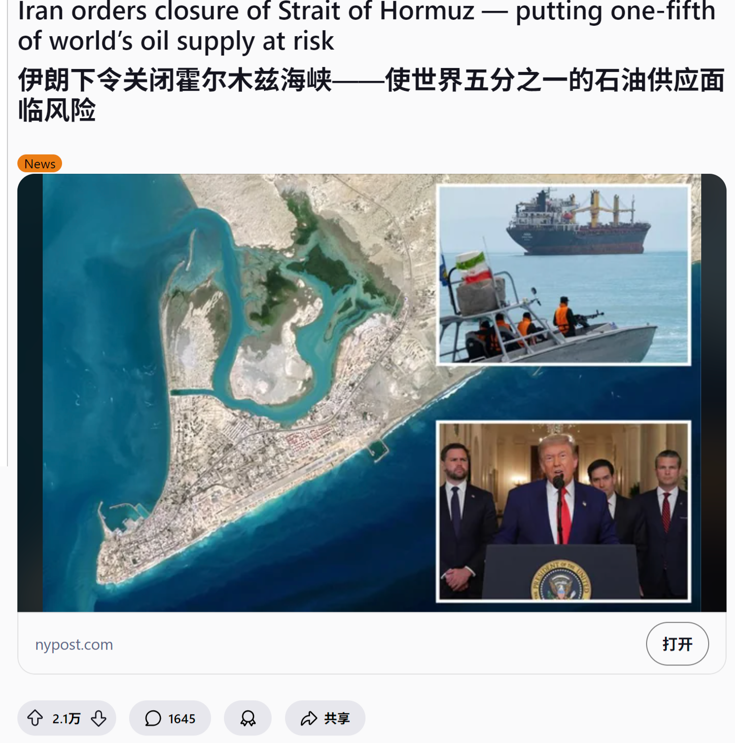 外网reddit热评:美国人怎么看 伊朗下令关闭霍尔木兹海峡
