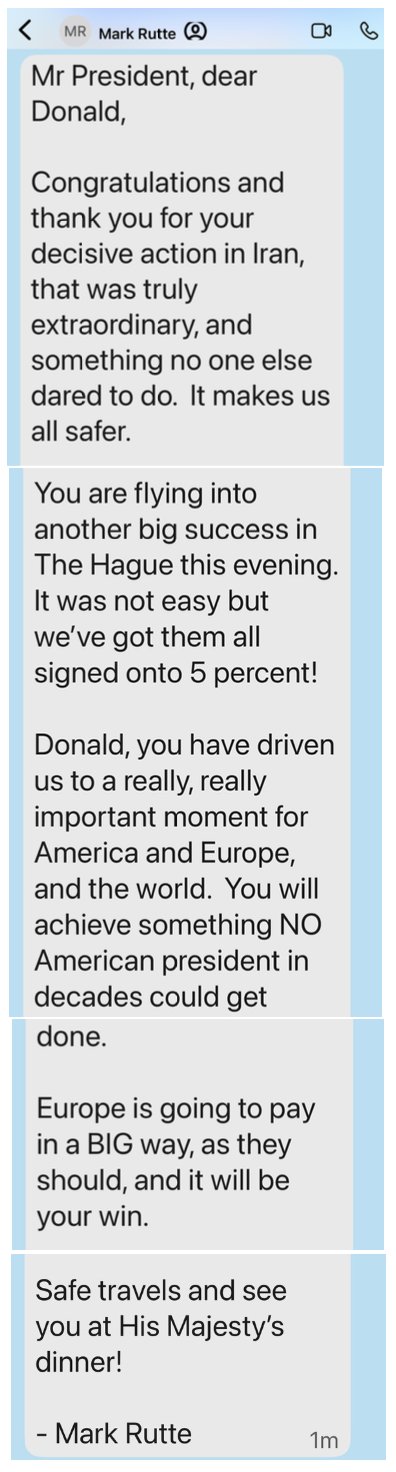 Copy of NATO's Mark Rutte's text message to Donald J. Trump