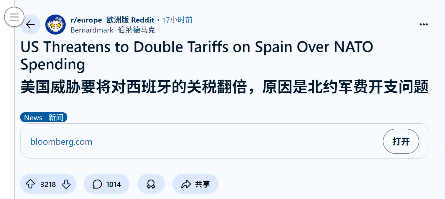 来源:https://www.reddit.com/r/europe/comments/1lk8u15/us_threatens_to_double_tariffs_on_spain_over_nato/