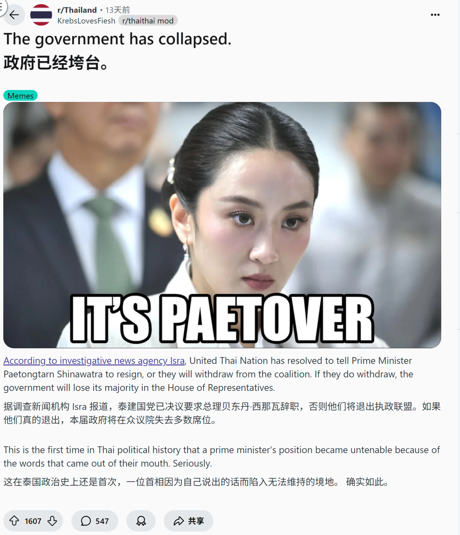 来源:https://www.reddit.com/r/Thailand/comments/1lfauj1/the_government_has_collapsed/
