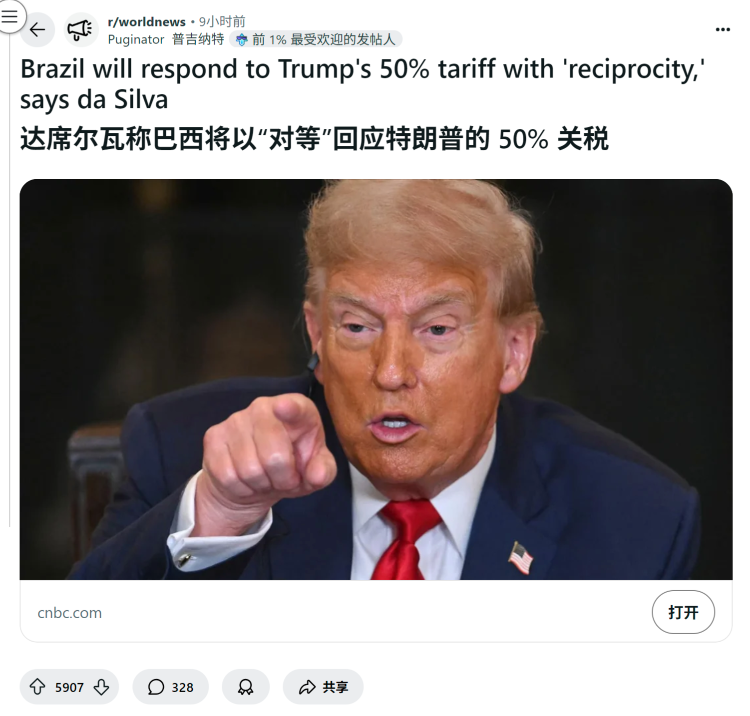 外网reddit热评 美国人如何看巴西将以“对等”回应特朗普的 50% 关税