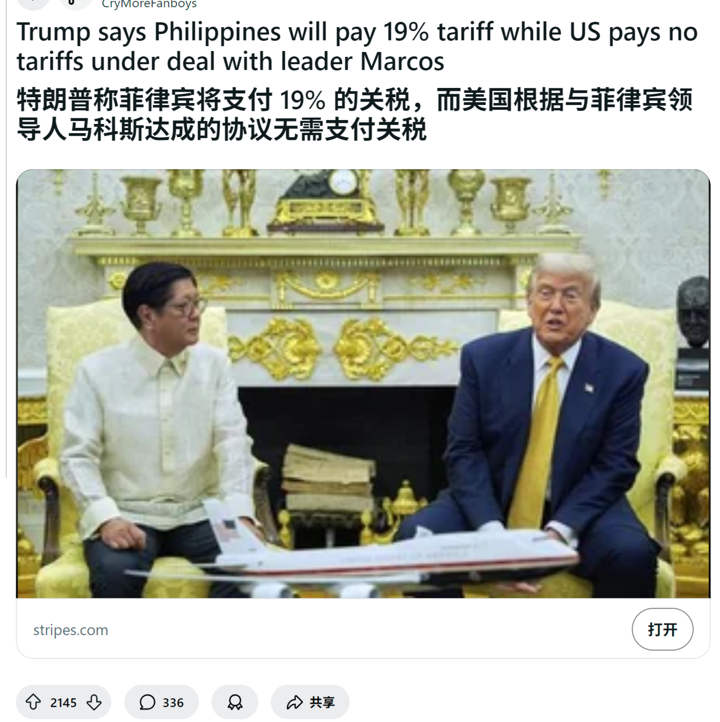 来源:https://www.reddit.com/r/worldnews/comments/1m6u6ji/trump_says_philippines_will_pay_19_tariff_while/