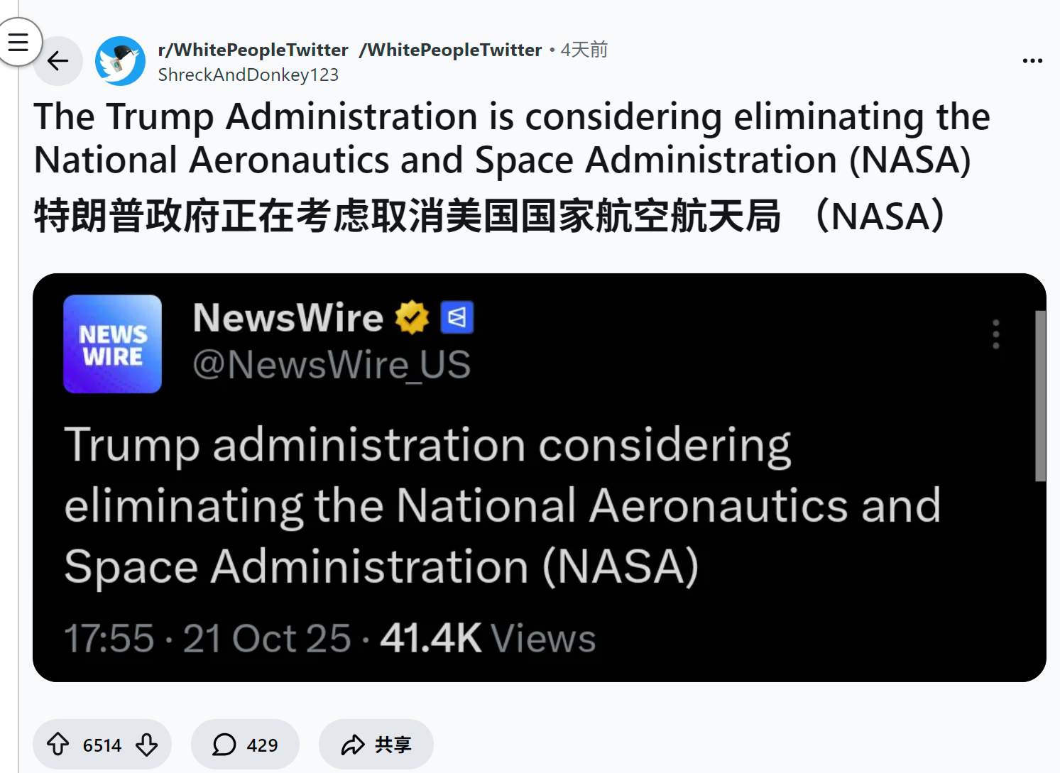 外网reddit如何看特朗普政府正在考虑取消美国国家航空航天局 (NASA)