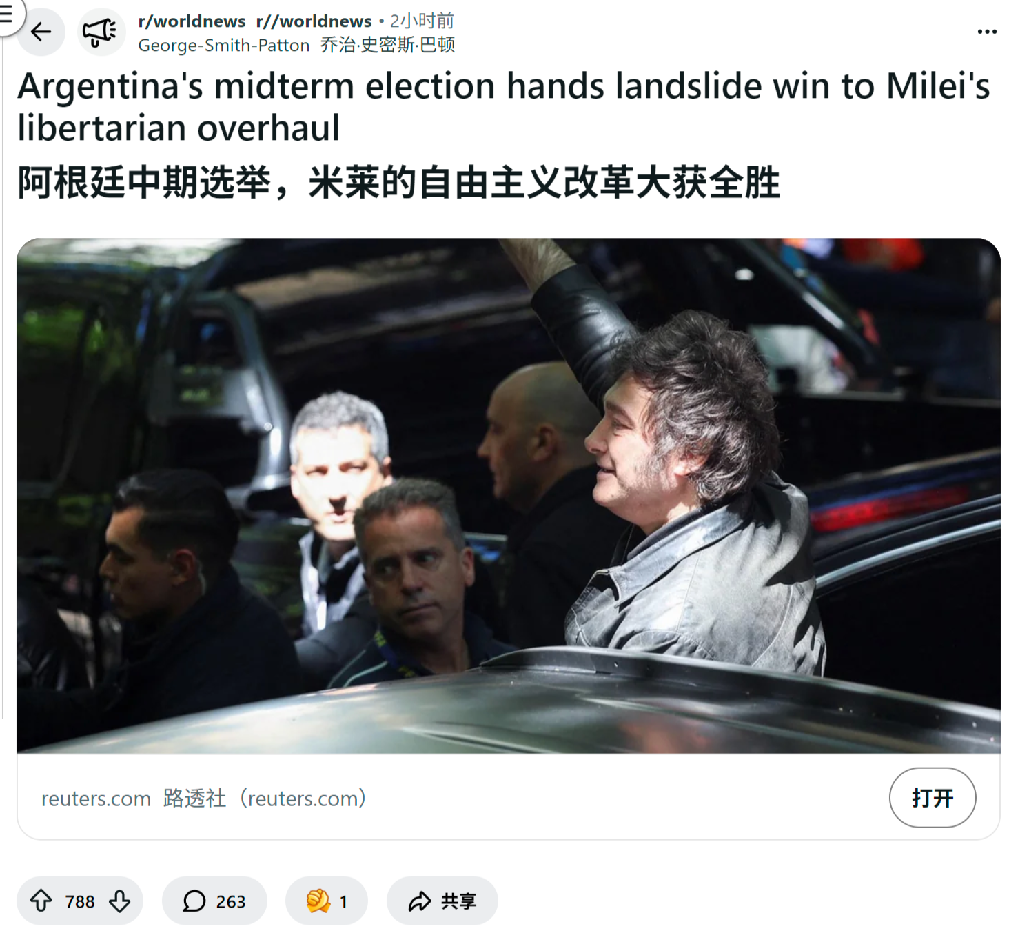 reddit热议 阿根廷中期选举,米莱的自由主义改革大获全胜