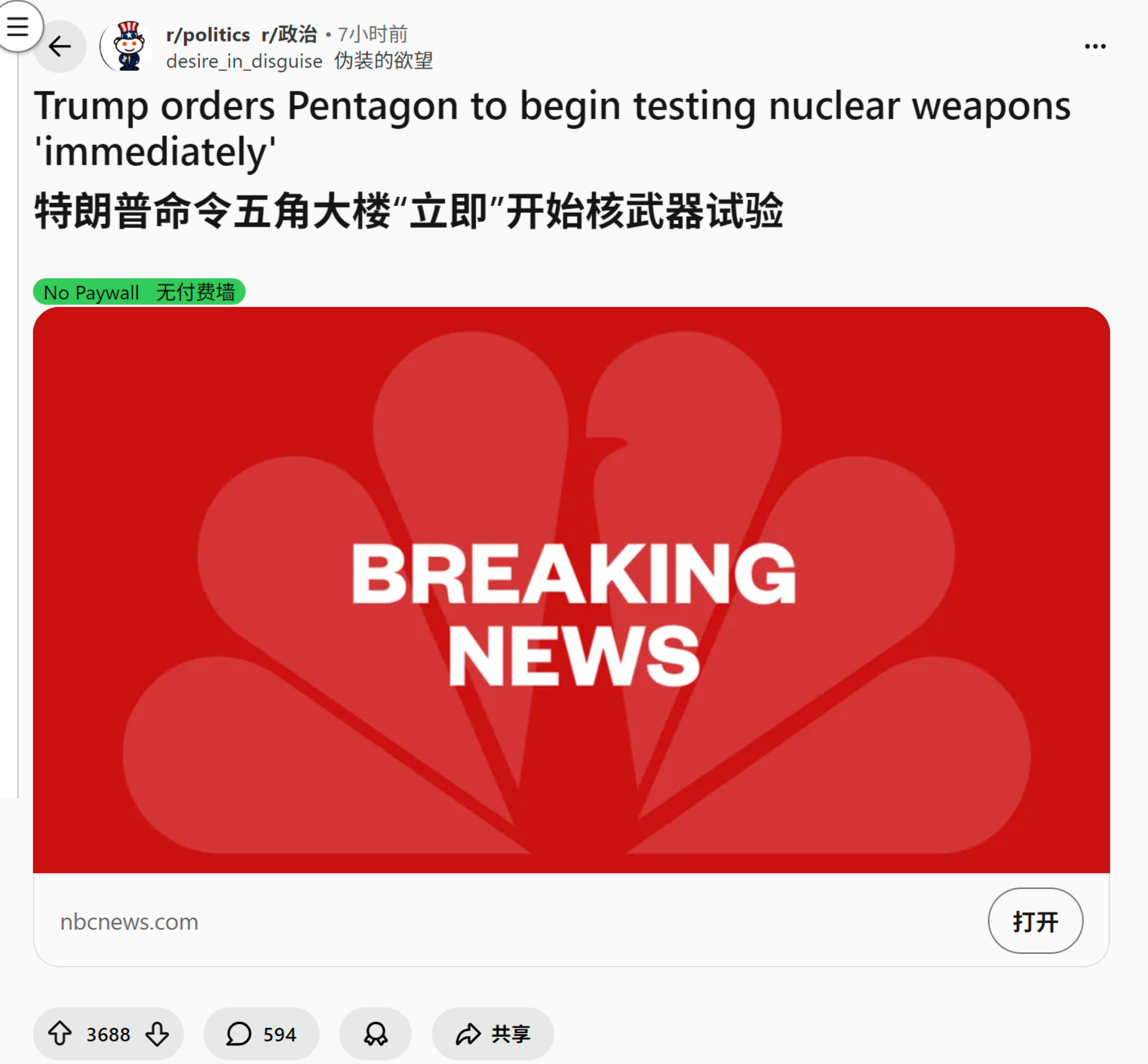 来源:https://www.reddit.com/r/politics/comments/1ojna7k/trump_orders_pentagon_to_begin_testing_nuclear/