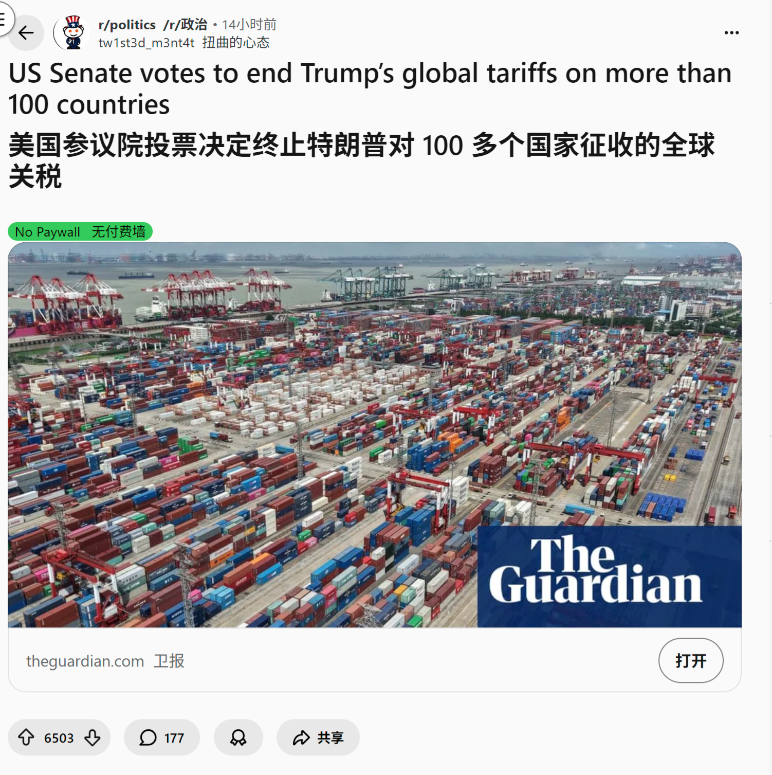 来源:https://www.reddit.com/r/politics/comments/1ok9fzf/us_senate_votes_to_end_trumps_global_tariffs_on/