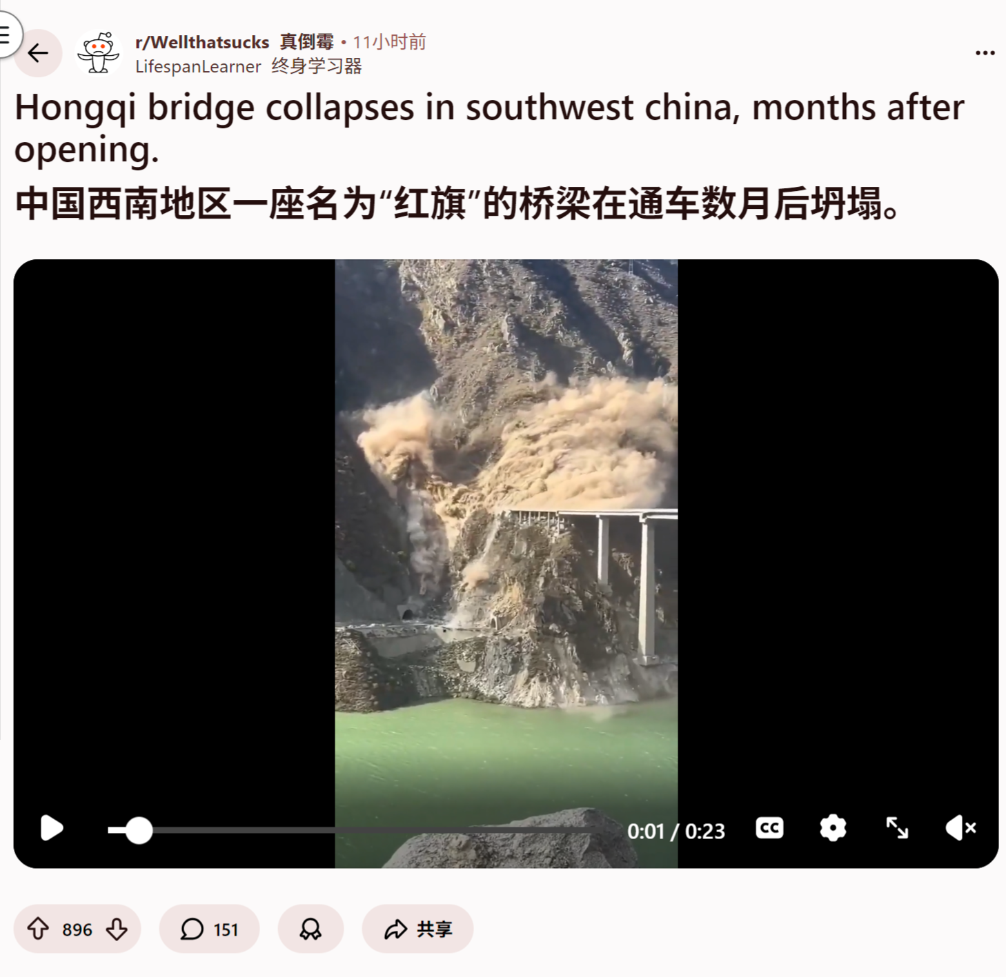 reddit头条 外国人热议中国红旗桥通车数月坍塌