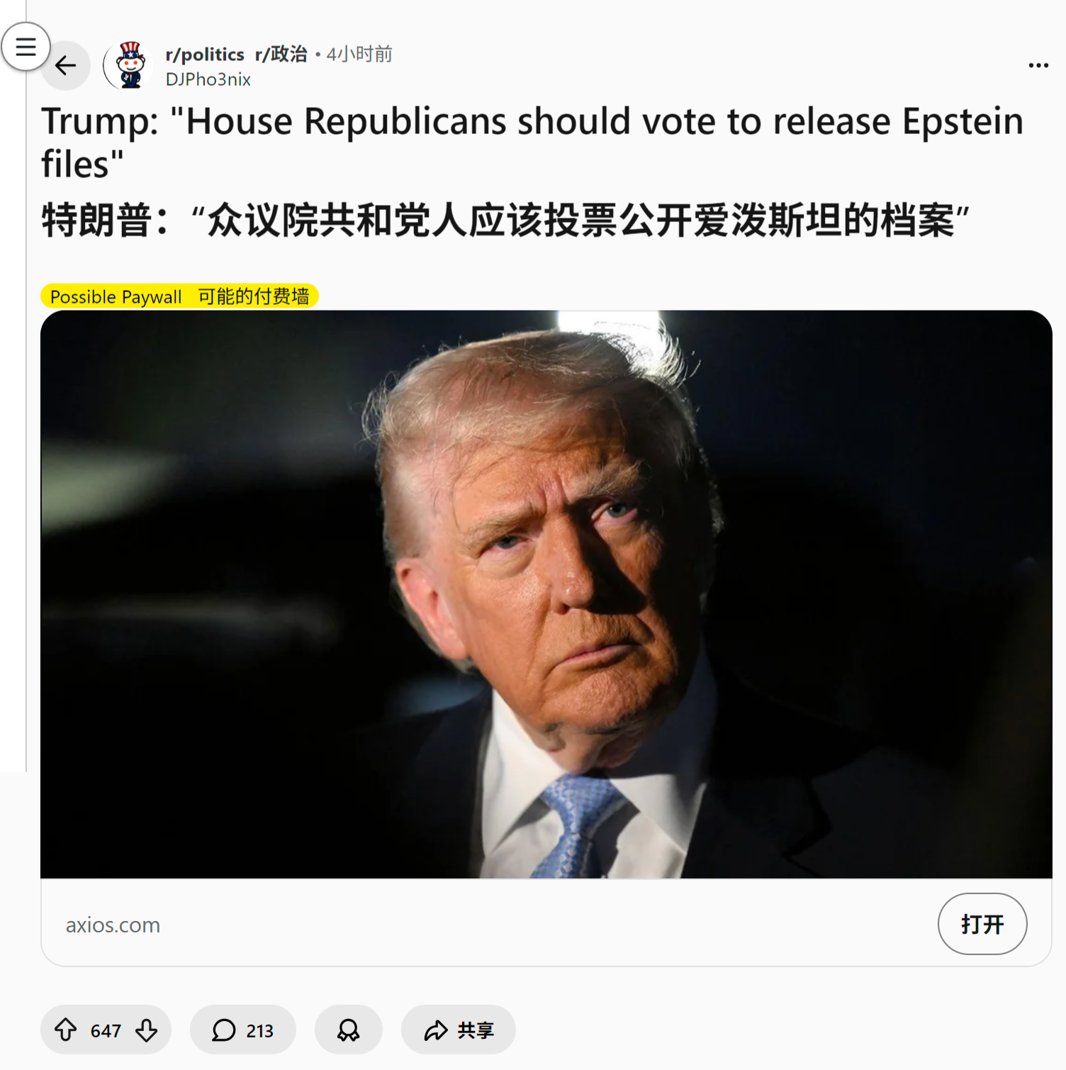 来源:https://www.reddit.com/r/politics/comments/1oz5x0p/trump_house_republicans_should_vote_to_release/