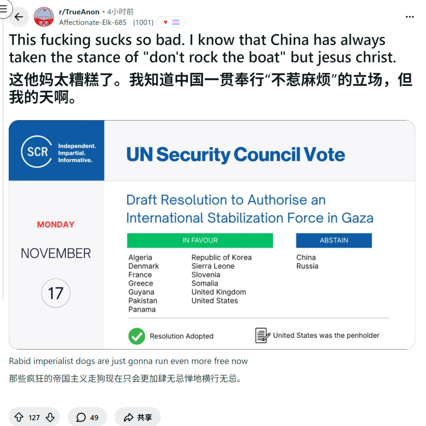 外国人希望中国拯救加沙。这他妈太糟糕了。我知道中国一贯奉行“不惹麻烦”的立场,但我的天啊。