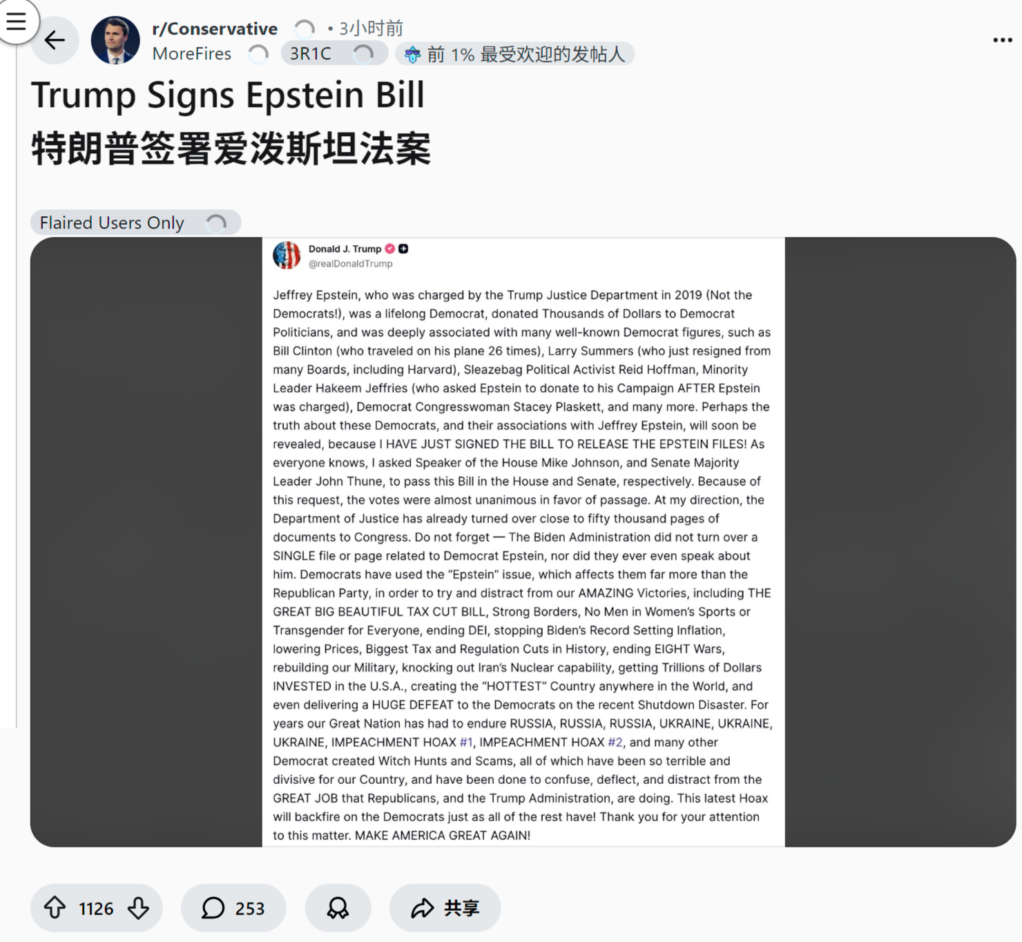 来源:https://www.reddit.com/r/Conservative/comments/1p1q675/trump_signs_epstein_bill/