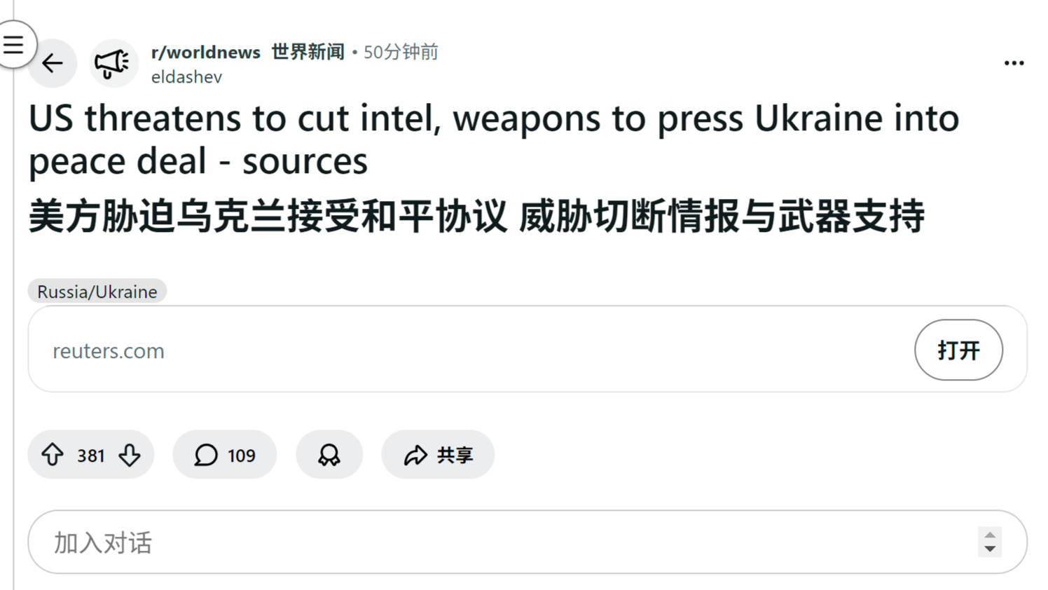reddit热议 美方胁迫乌克兰接受和平协议 威胁切断情报与武器支持