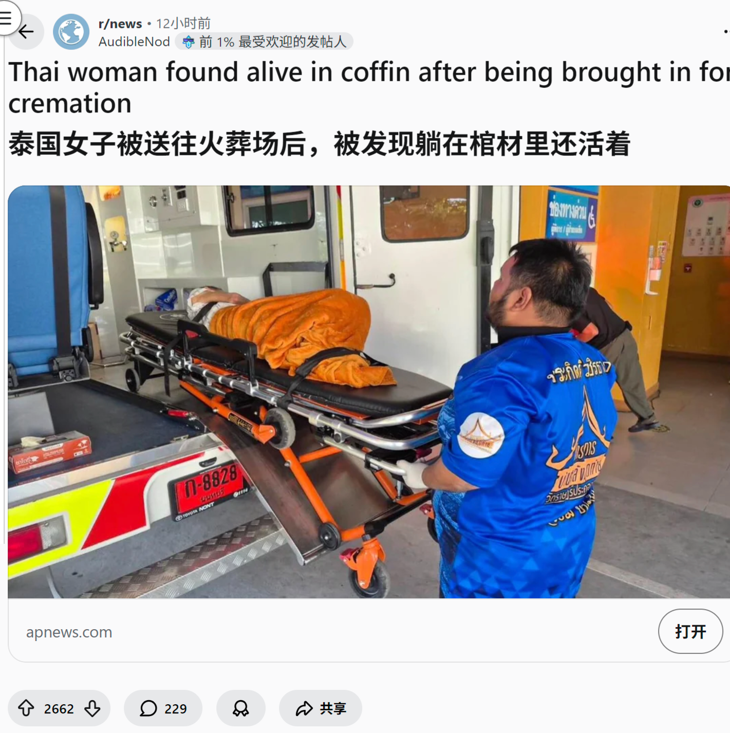 泰国女子被送往火葬场后,被发现躺在棺材里还活着