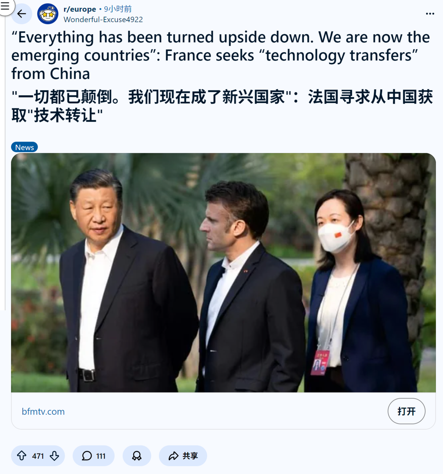 欧洲热议 "一切都已颠倒。我们现在成了新兴国家":法国寻求从中国获取"技术转让"