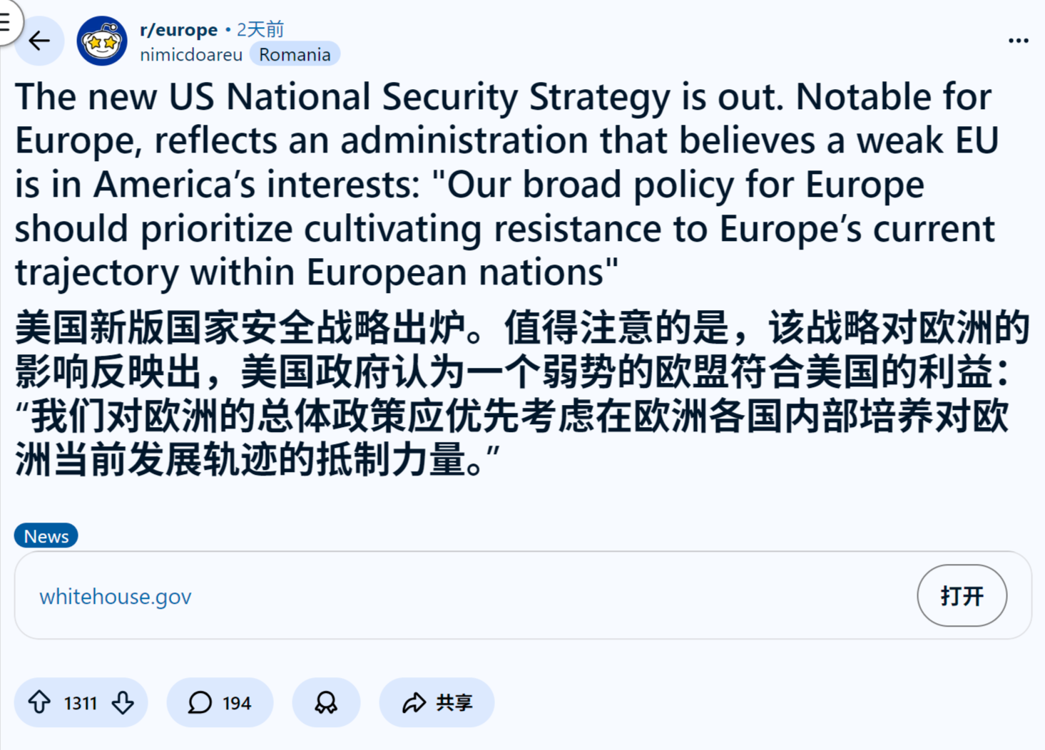 - reddit热议美国人怎么看白宫刚刚公布了新的国家安全战略文件