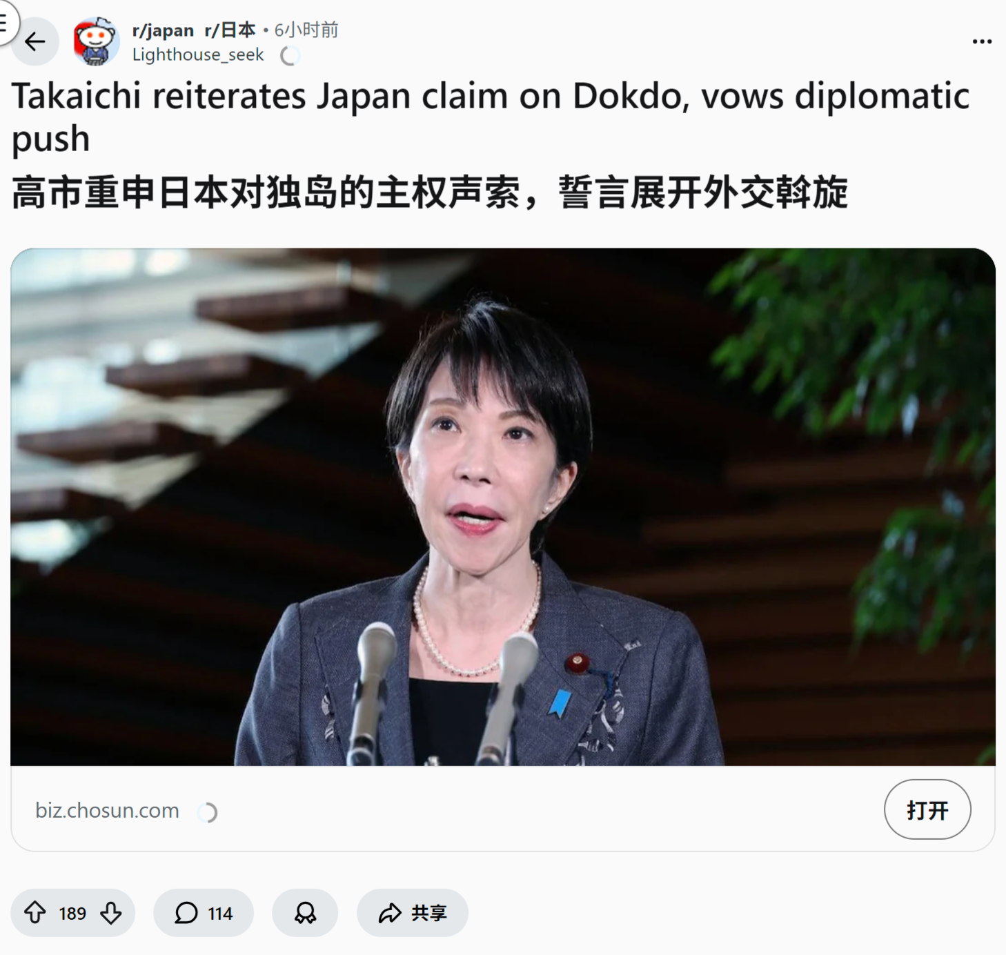 来源:https://www.reddit.com/r/japan/comments/1pik6em/takaichi_reiterates_japan_claim_on_dokdo_vows/