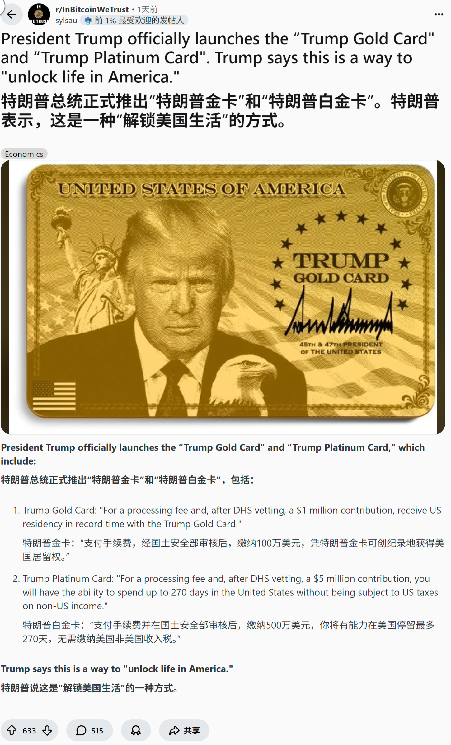 reddit热议 美国人怎么看特朗普总统正式推出“特朗普金卡”和“特朗普白金卡”