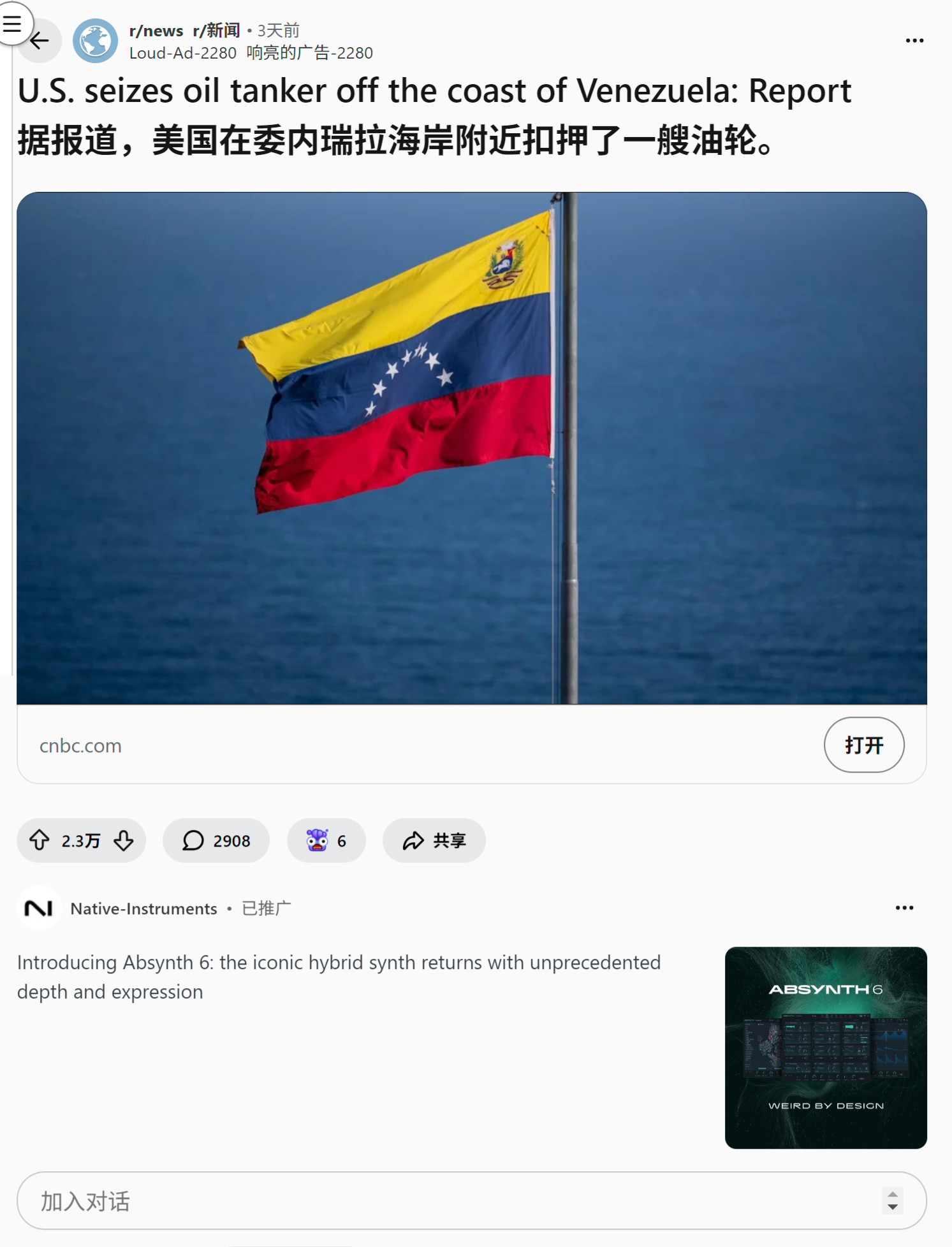 reddit爆火 美国人怎么看美国在委内瑞拉海岸附近扣押了一艘油轮