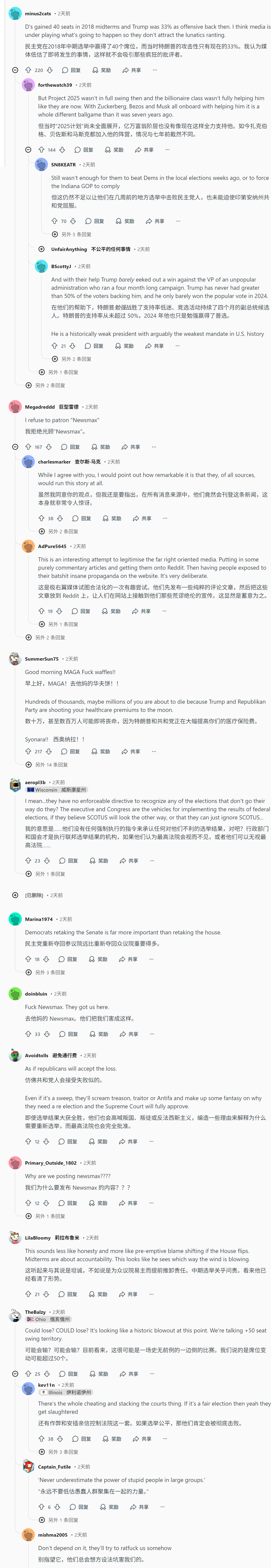 reddit是一个亲民主党的的类似贴吧的软件,在一个政策吧里边美国人讨论特朗普承认可能失去众议院。