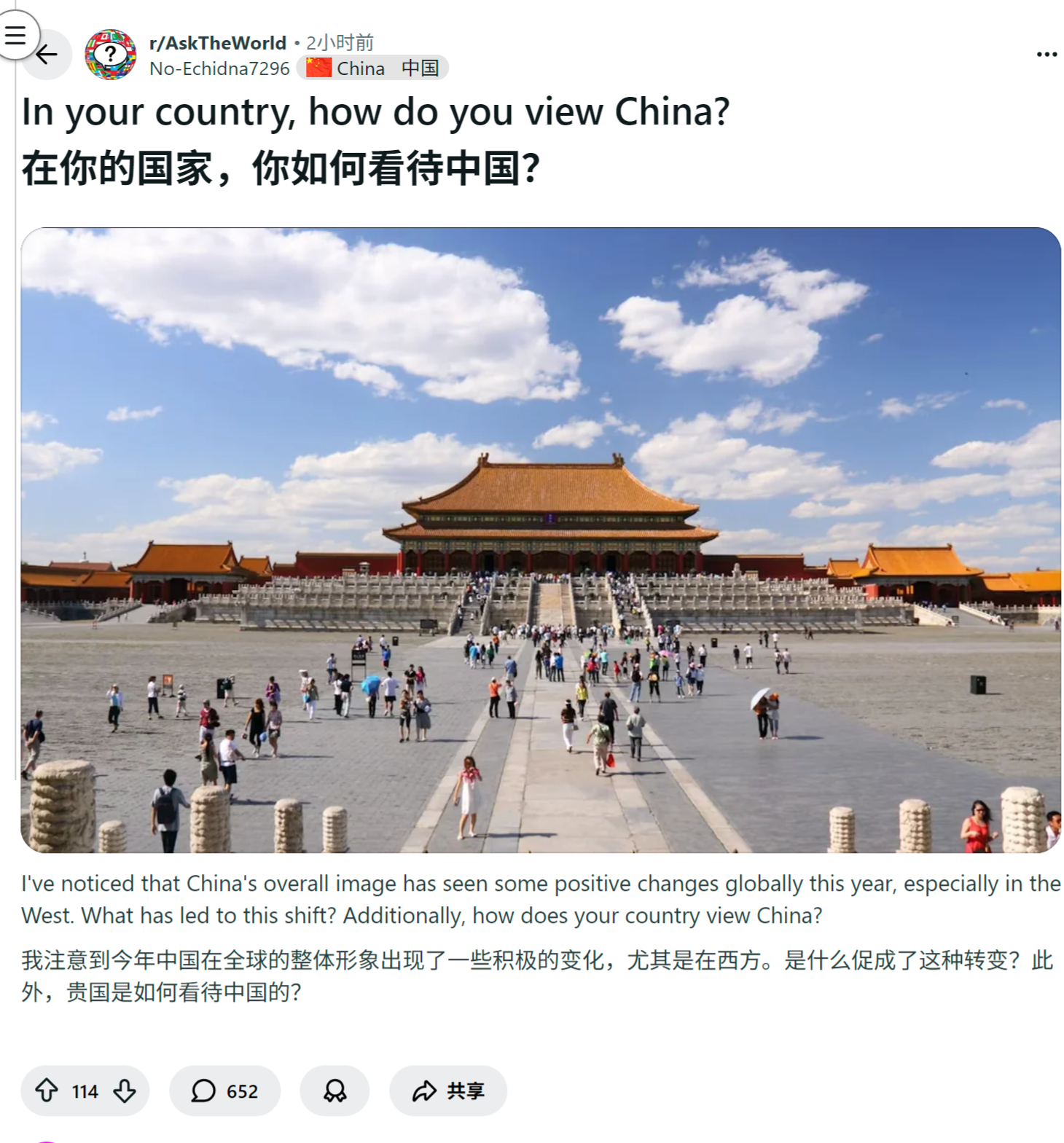 来源:https://www.reddit.com/r/AskTheWorld/comments/1prdx8k/in_your_country_how_do_you_view_china/
