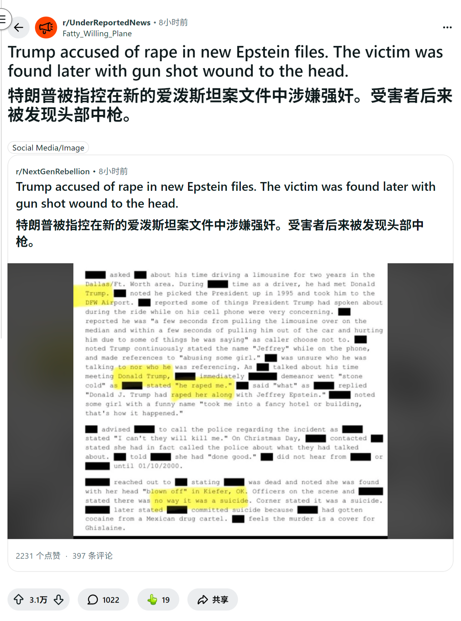 reddit爆火 特朗普被指控在新的爱泼斯坦案文件中涉嫌强奸。受害者后来被发现头部中枪。