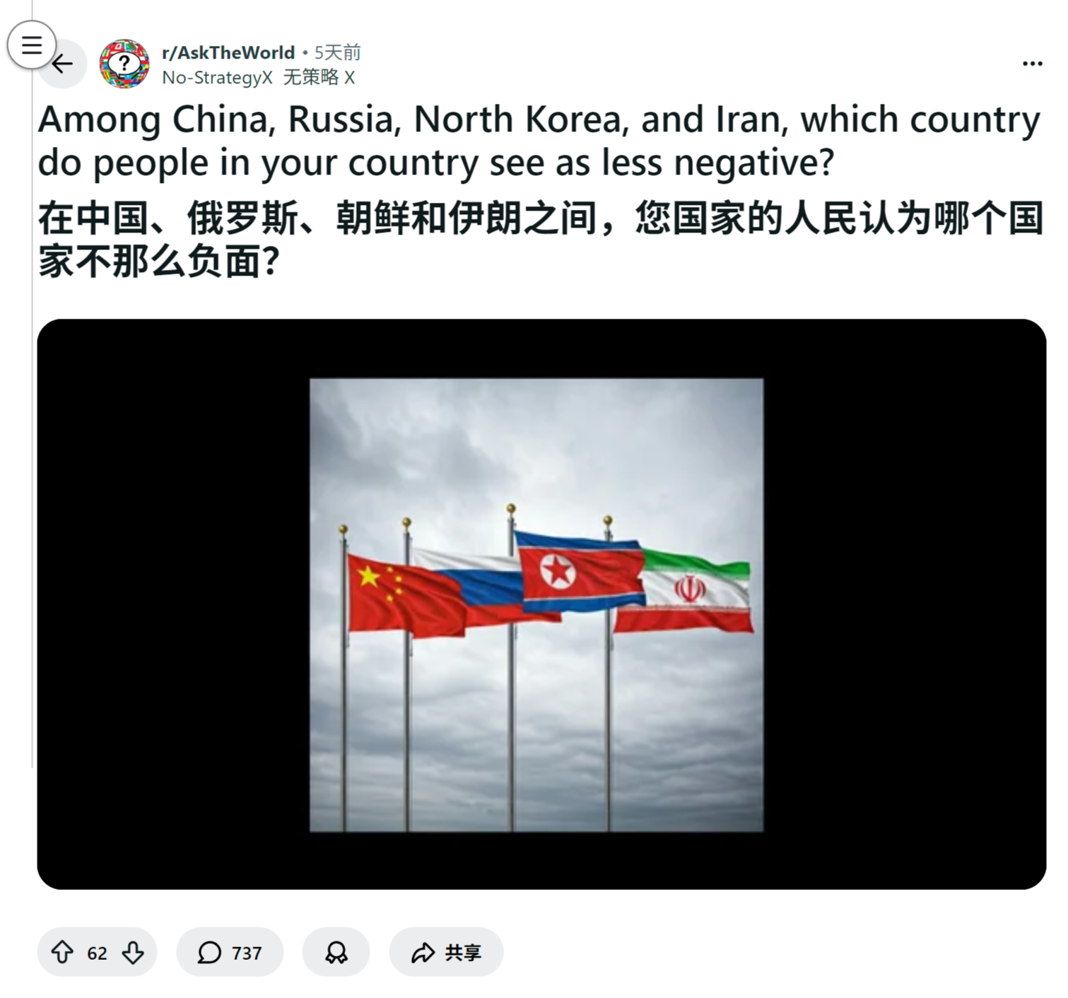 reddit热议在中国、俄罗斯、朝鲜和伊朗之间,您国家的人民认为哪个国家不那么负面?