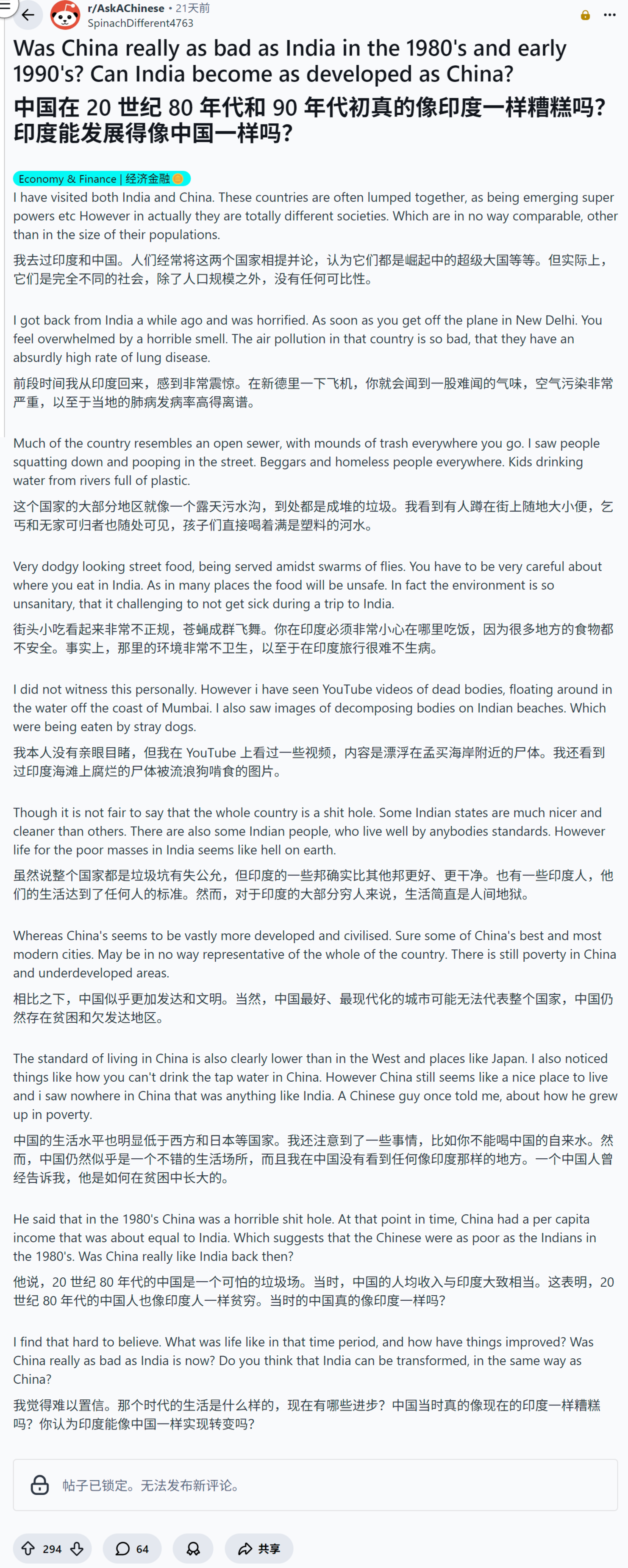 我觉得难以置信。那个时代的生活是什么样的,现在有哪些进步?中国当时真的像现在的印度一样糟糕吗?你认为印度能像中国一样实现转变吗?