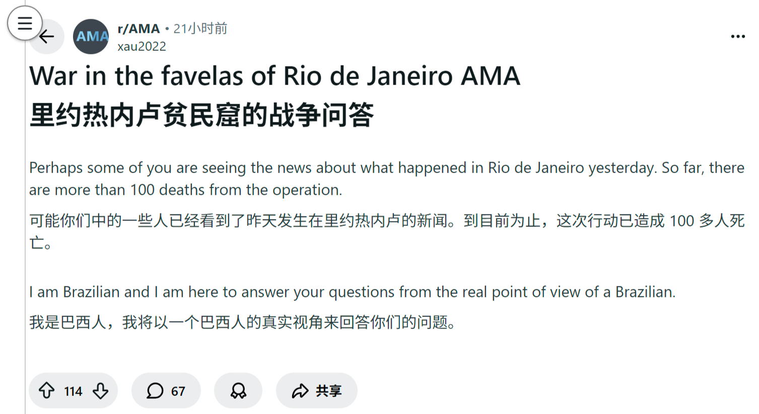 来源:https://www.reddit.com/r/AMA/comments/1ojbbhp/war_in_the_favelas_of_rio_de_janeiro_ama/