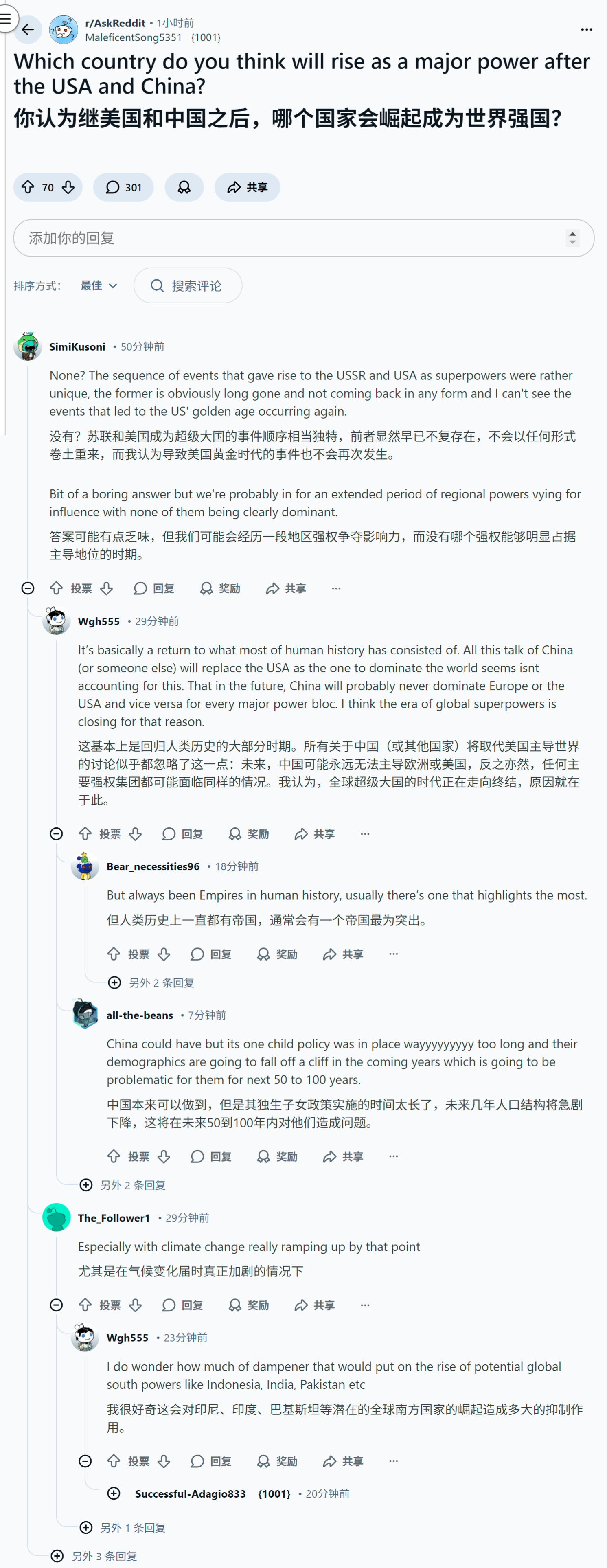 来源:https://www.reddit.com/r/AskReddit/comments/1p9peir/which_country_do_you_think_will_rise_as_a_major/