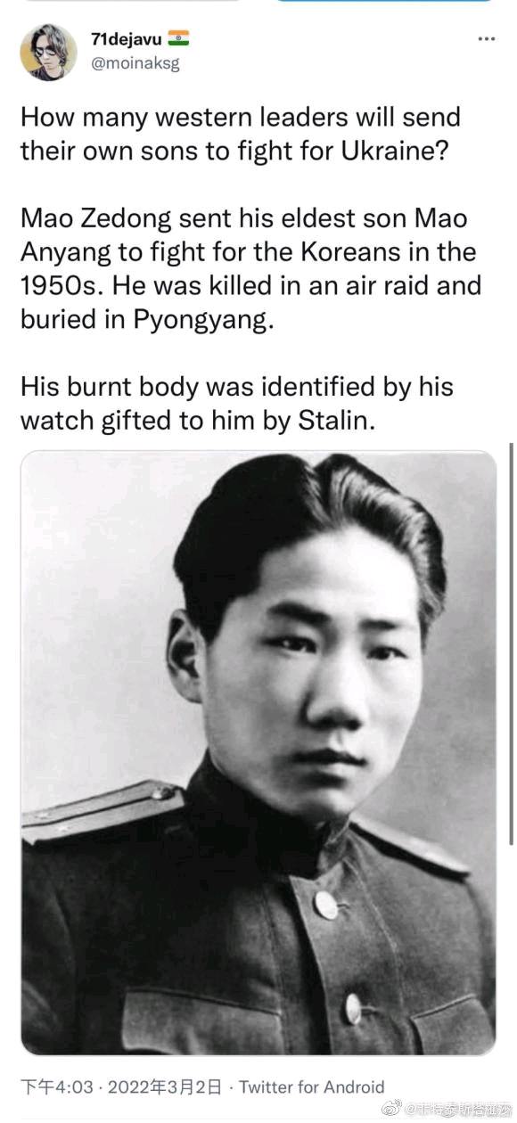 毛泽东派遣自己的儿子毛岸英在1950为朝鲜而战。他因空袭遇难死葬在平壤。