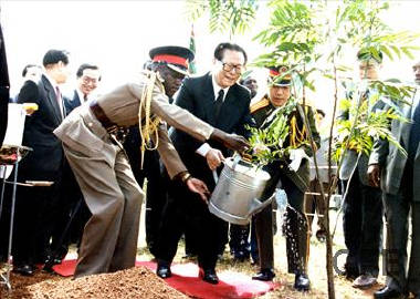 11点半,在结束同莫伊总统的会谈后,江同志乘车来到独立公园栽种友谊树。这时,久候在公园内的数百名身穿整洁校服的男女中小学生和身穿艳丽民族服装的妇女们跳起了欢快的民族舞蹈,高唱欢迎的歌曲。