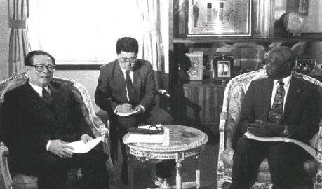 1996年5月9日上午,江同志同肯尼亚总统莫伊在肯尼亚国家宫举行会谈。双方就中肯、中非关系以及国际和地区形势等许多议题进行了深入探讨。会谈后,双方出席了签字仪式。