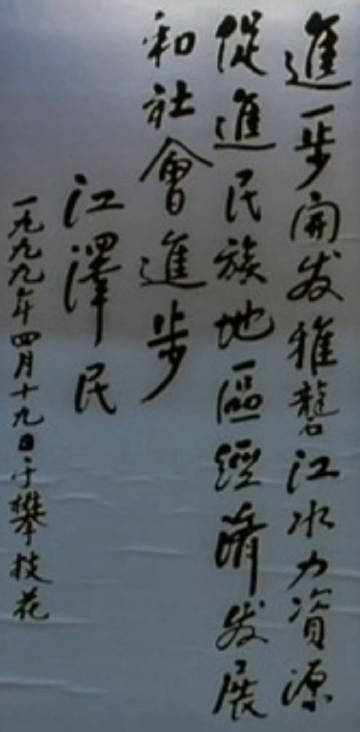 1999年4月19日,江同志来到四川省攀枝花市二滩水电站发电机组施工现场视察,他与电站建设者们亲切握手,表示问候。随后登上雄踞在山谷间的巍巍大坝,他赞许二滩电站在国外封锁、国内资金紧张下开挖的导流洞是“决心洞、争气洞”,指出二滩电站建设万事俱备,只欠东风,非上不可,敢创世界一流,长了中国人的志气,最后合影留念并欣然题词勉励。