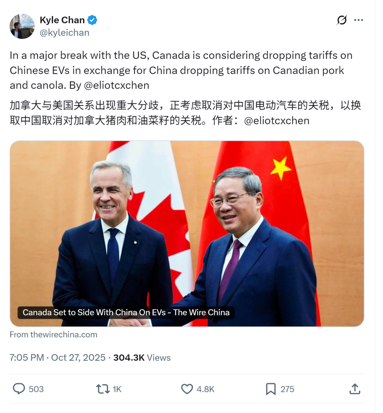 加拿大与美国关系出现重大分歧,正考虑取消对中国电动汽车的关税,以换取中国取消对加拿大猪肉和油菜籽的关税。作者:@eliotcxchen