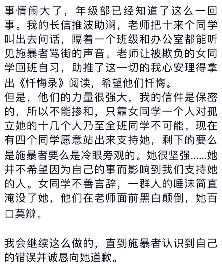 有一段时间没上这个网,我听了同志们的建议去反抗校园暴力了。但是目前还没什么成果,不想理事的人太多了,从众去孤立那个女同学的人占据上风……我想问问同志们有没有什么建议。我们已经高三了,一月份要一模,那个女同学日子更不好过