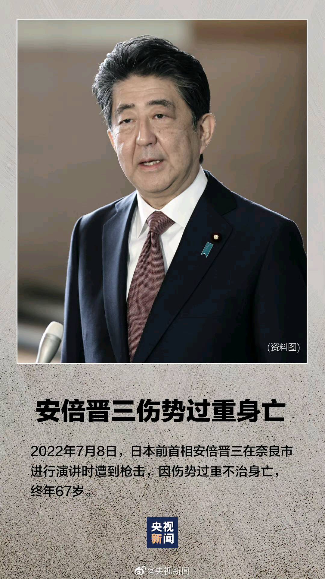 7月8日,日本前首相安倍晋三在遭到枪击后,因伤势过重不治身亡,终年67岁。