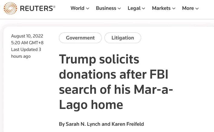 “美国前总统特朗普周二试图将联邦调查局(FBI)搜查其佛罗里达州住宅的消息转化为利益。”路透社称,当天,他敦促“每一个爱国的美国人”为自己的竞选活动捐款。商业鬼才