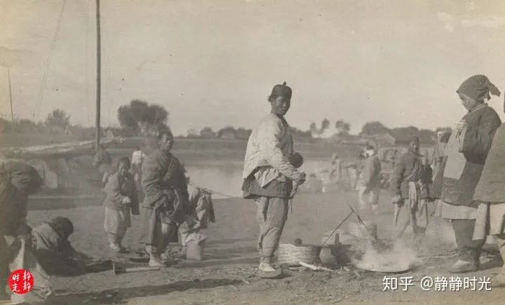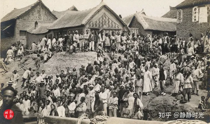 图为在河堤边上的大量受灾的百姓,这些百姓都好奇的盯着拍摄他们的相机,后面的房屋是当时百姓的房屋,这些简陋的房屋在这次水灾中幸存下来。而当时清政府也是腐朽不堪,防灾救灾能力也很薄弱,使得这里的灾情更显严重。