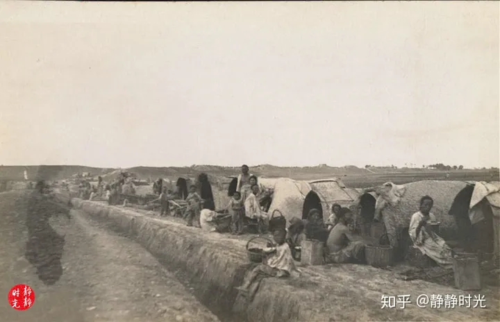 图为受灾的百姓在湿地上搭建的简陋帐篷,这应该是清政府统一安置的。这些帐篷都是用破旧的芦苇席搭建的,当时百姓就在这破旧狭小的帐篷里面生活。