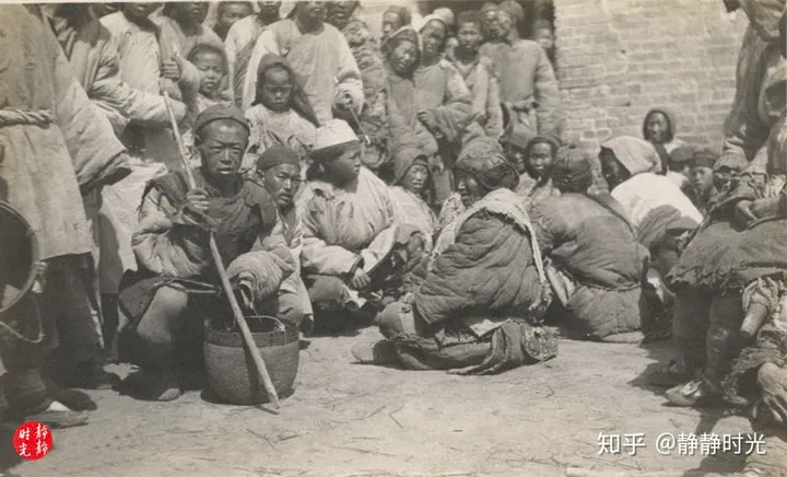 图为清政府的救灾人员正在发放救灾粮食,栅栏外站满了等候发粮的百姓,虽然每人分到的粮食只有一点点,但是总可以先缓一缓目前的饥饿。