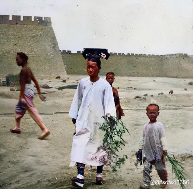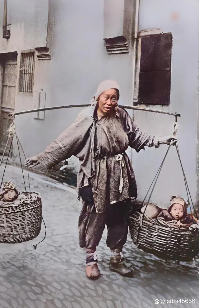 除了那些有工作的人,还有生活在温饱线下的穷苦人。照片中的母子三人,站在土房子前,身上穿的棉衣破破烂烂,根本就不能御寒。女子裹着小脚,她的女儿也裹着一双小脚,封建社会对女性的束缚非常严重,女性们的生活比男性更加艰辛。面对镜头,三人显得有些紧张,脸上露出不自然的表情。