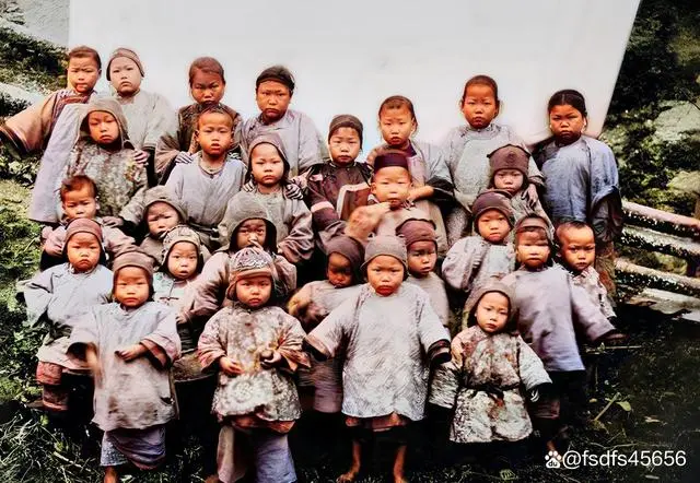 另外,照片中的小女孩也展现了阶层差异。坐在凳子上的小女孩是富贵人家的大小姐,穿着漂亮的服装,戴着好看的头饰。
