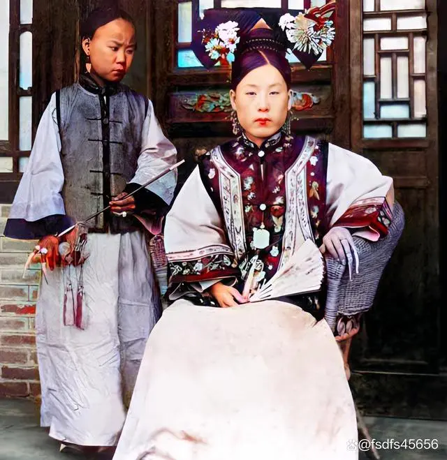 而身后的两个女孩则是她的朋友和仆人,她们的生活条件与主人有着很大的差别。这种阶层差异在清朝时期是非常明显的,而这种差异也是当时社会不平等的一个体现。