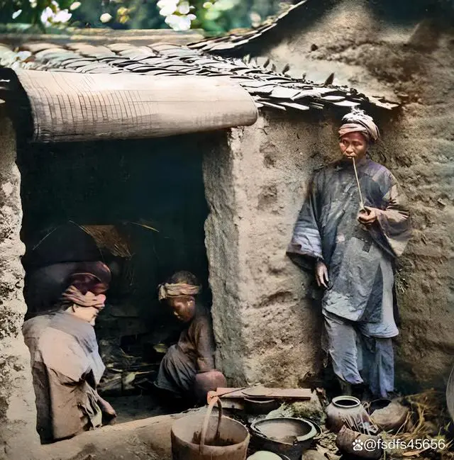 在巴蜀地区的乡下,一家人住在简陋的厨房里做饭。他们的房屋是用土坯垒砌而成,屋内没有任何家具,门口只放了几个盆盆罐罐。这张照片描绘了一些偏远地区的农村,许多穷苦人家连立锥之地都没有。