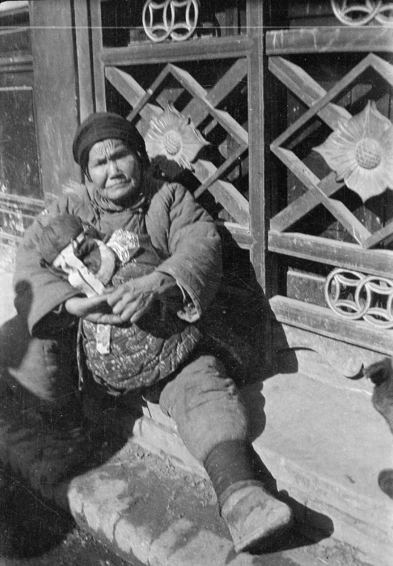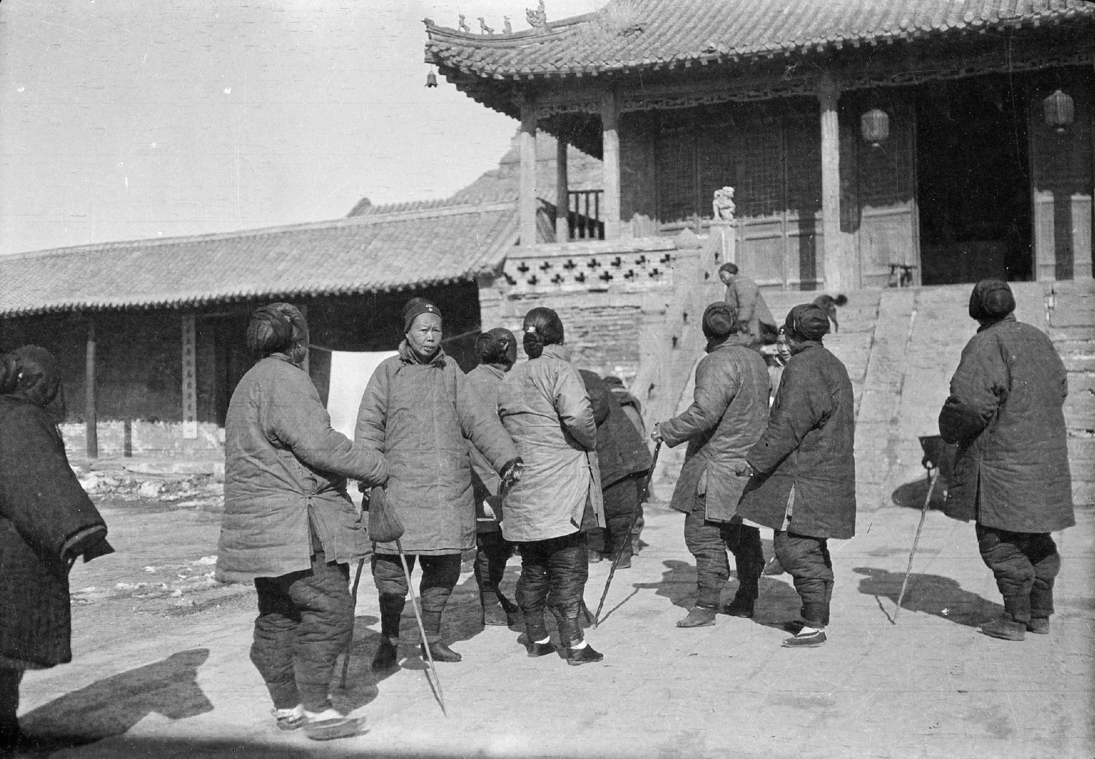 31、在教堂院子里,一位裹着小脚的老妇人。