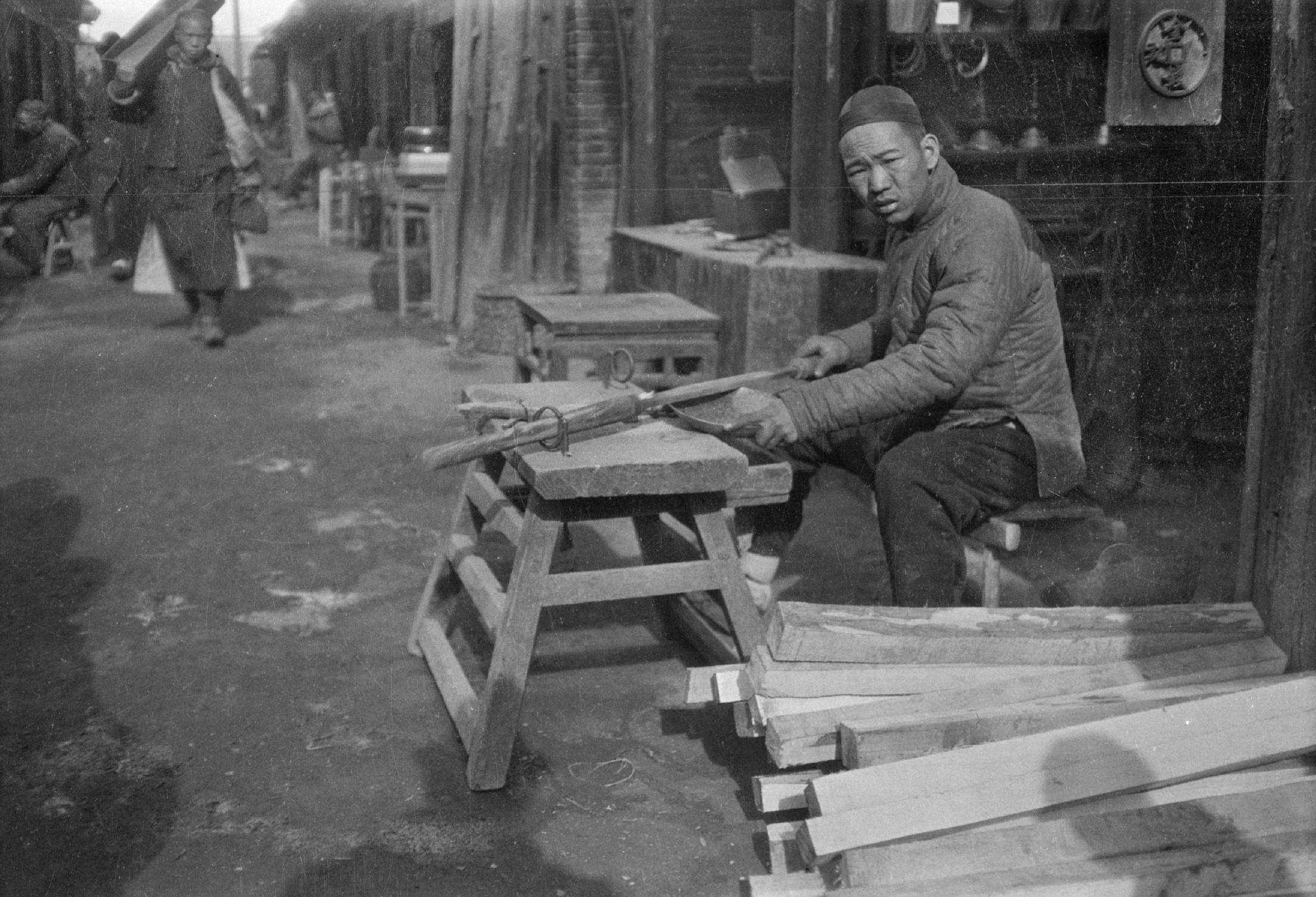 16、位于开封古城的南门附近的巷子中,一位木匠正在铺子门口锉着木条。