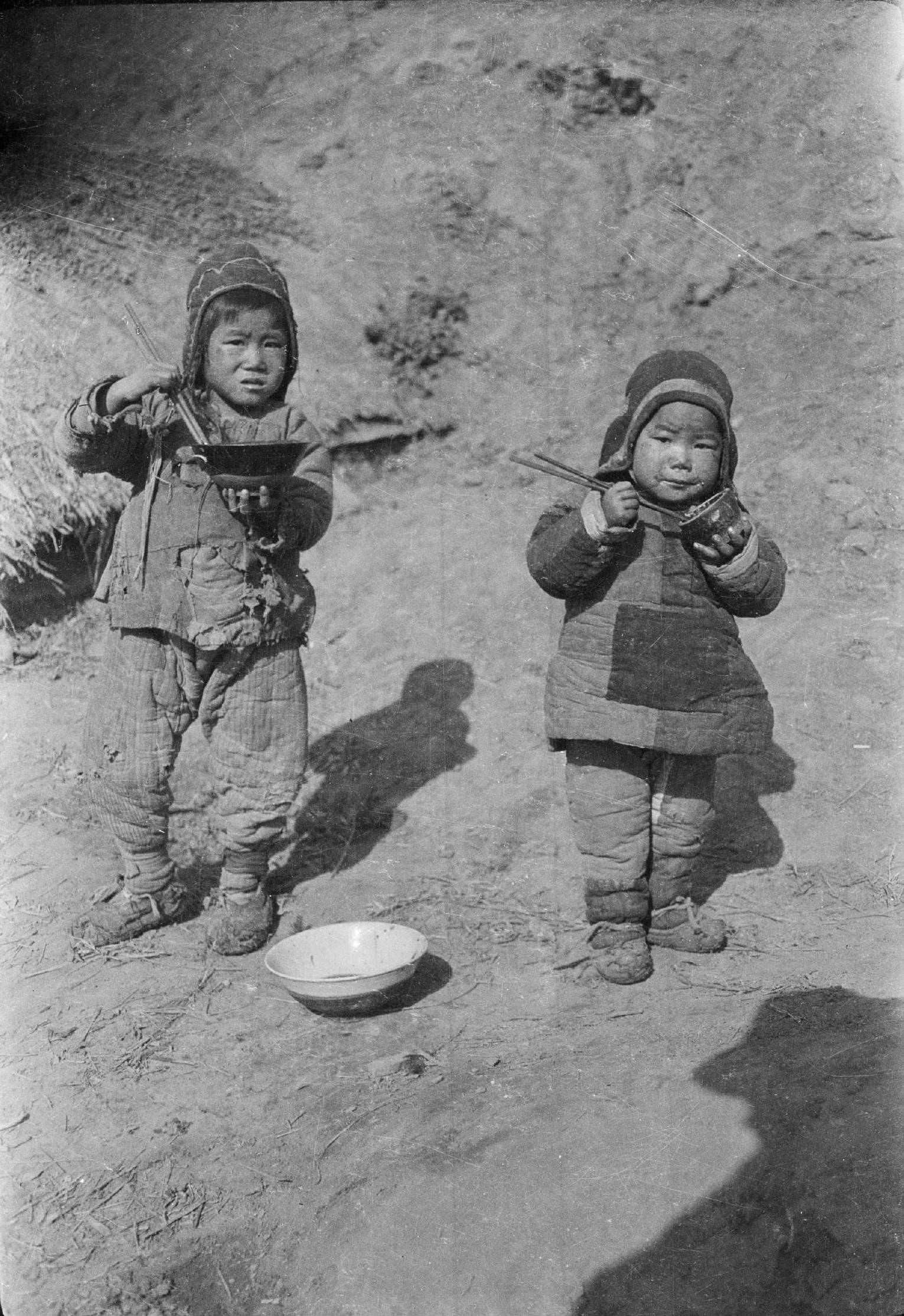 20、另外一个窑洞人家门口,两个孩子捧着碗正在吃饭,他们的脸上还粘着米粒。