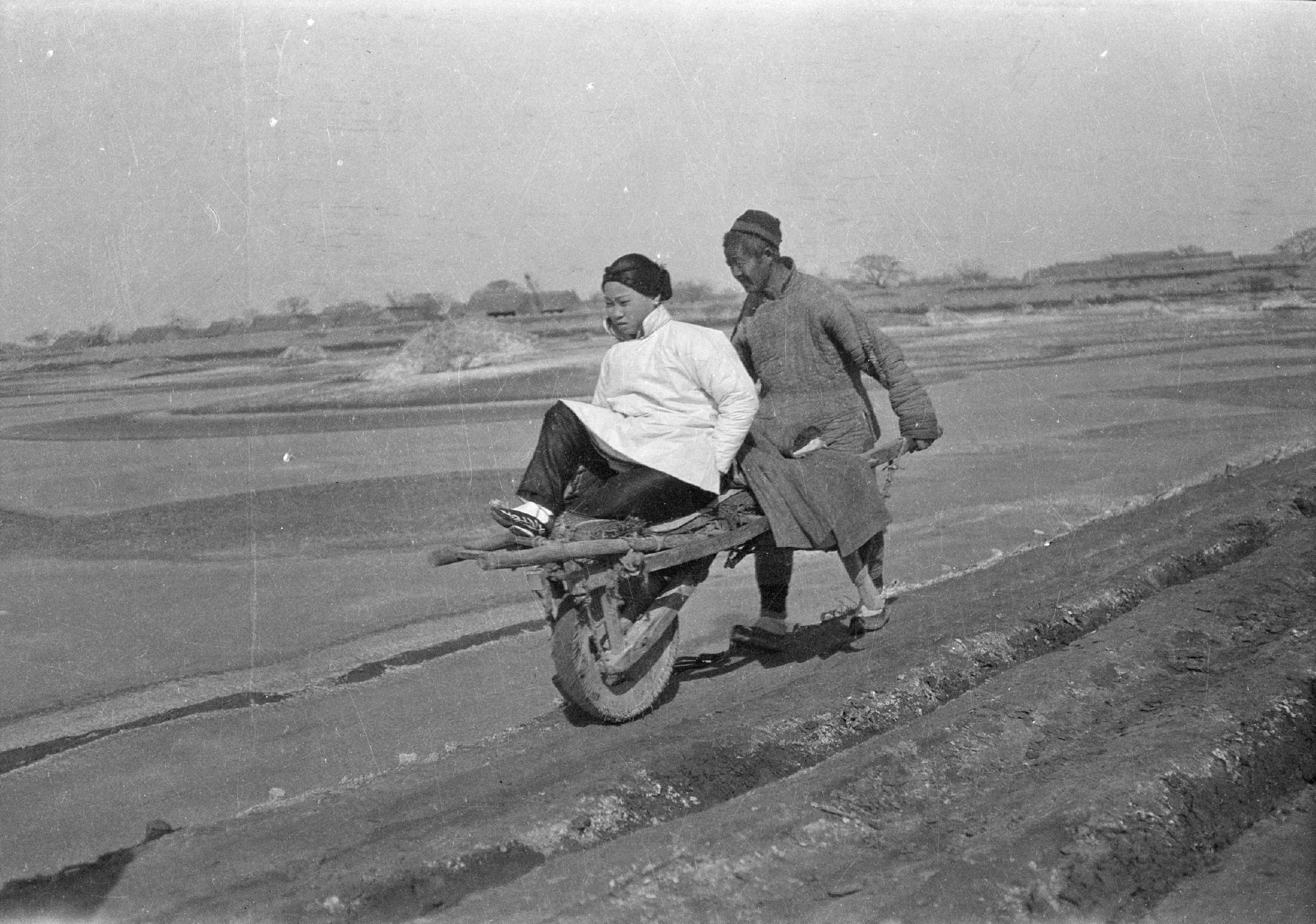 36、开封古城的南门外,一位穿着白衣的妇人,单独蜷坐在独轮车上。
