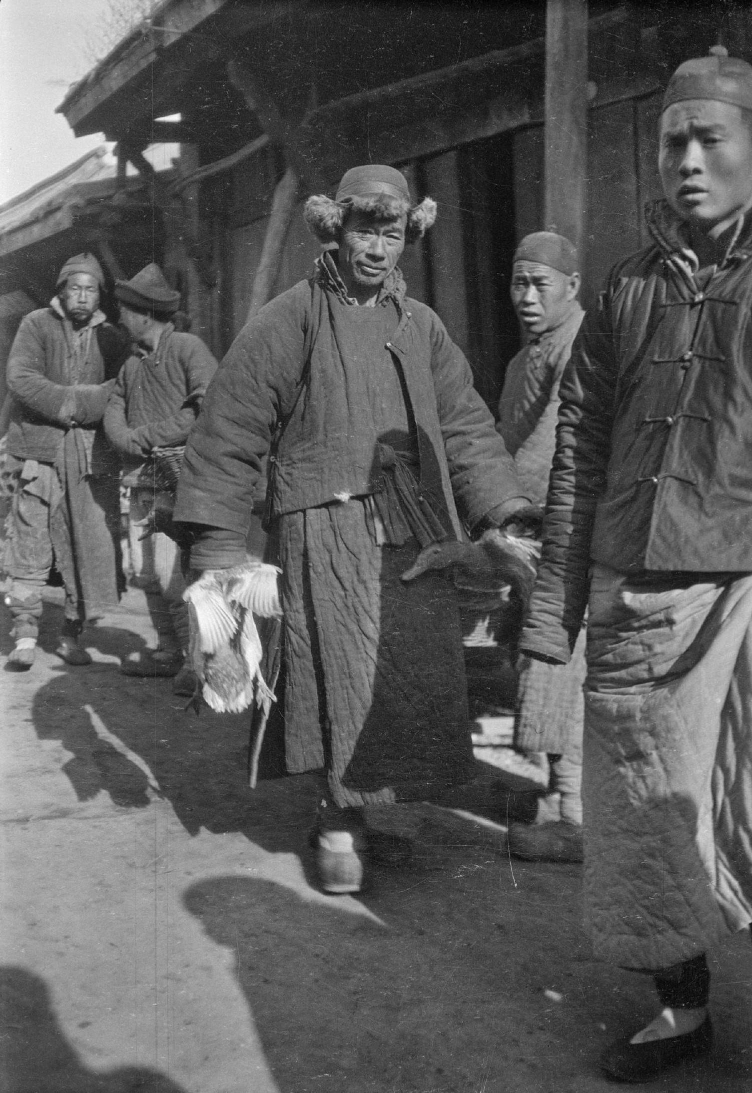 15、开封街头,一个中年人双手各抓着一只鸭子,其余人好奇的看着甘博在拍摄。